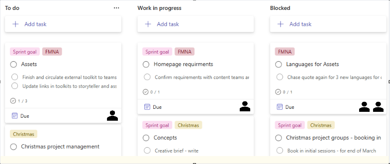 For a stand-up to work well, you need a visual record of your work. You can use Microsoft Planner, Trello, monday.com or a similar alternative for this. The tool isn’t important, but how you use it is. All you need to do is make sure you’re capturing all the tasks for your piece of work under either “work in progress” for things you are working on now, “blocked” where you are waiting for something outside your control, and “to do” for anything you haven’t got to yet.